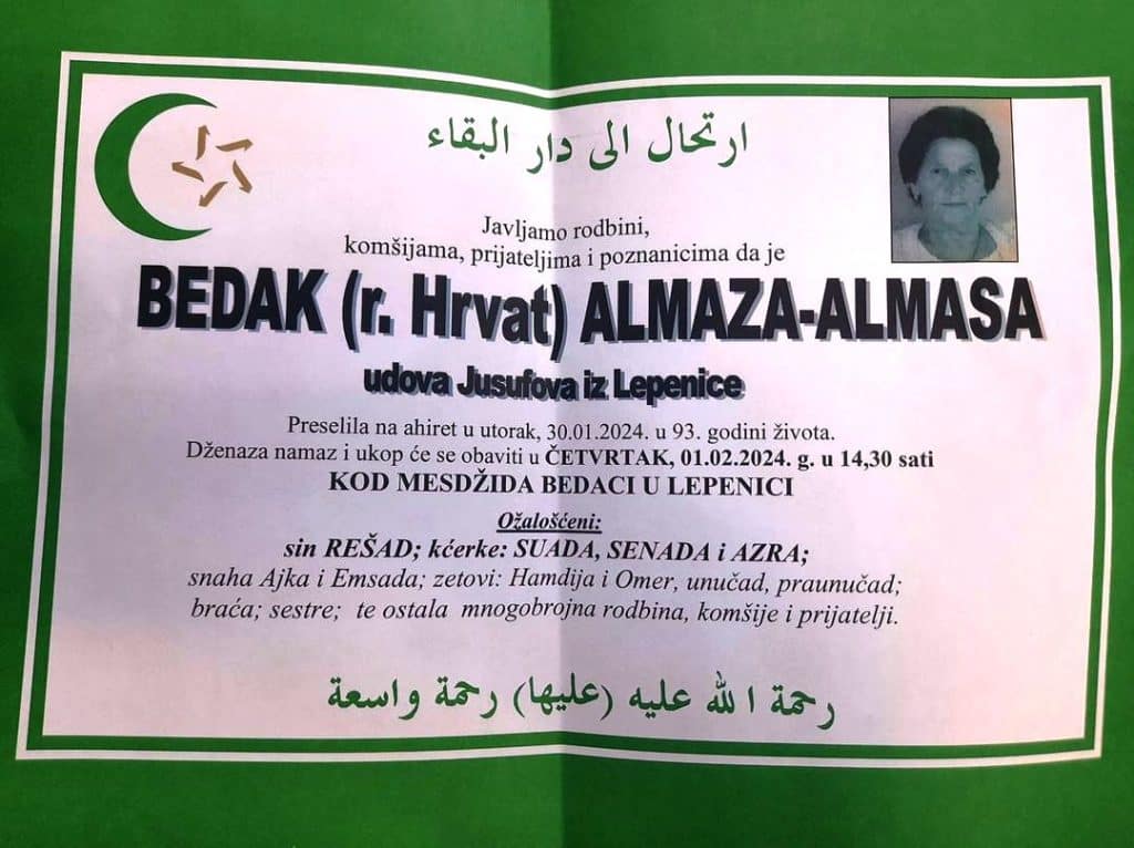 Dženaza namaz i ukop će se obaviti u ČETVRTAK, 01.02.2024. g. u 14,30 sati