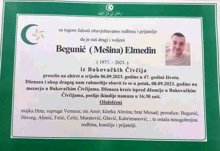 preselio na ahiret u srijedu 06.09.2023. godine u 47. godini života. Dženaza i ukop dragog nam rahmetlije obavit će se u petak, 08.09.2023. godine na mezarju u Bukovačkim Čivčijama. Dženaza kreće ispred džamije u Bukovačkim Čivčijama, poslije ikindije namaza u 16:30 sati.