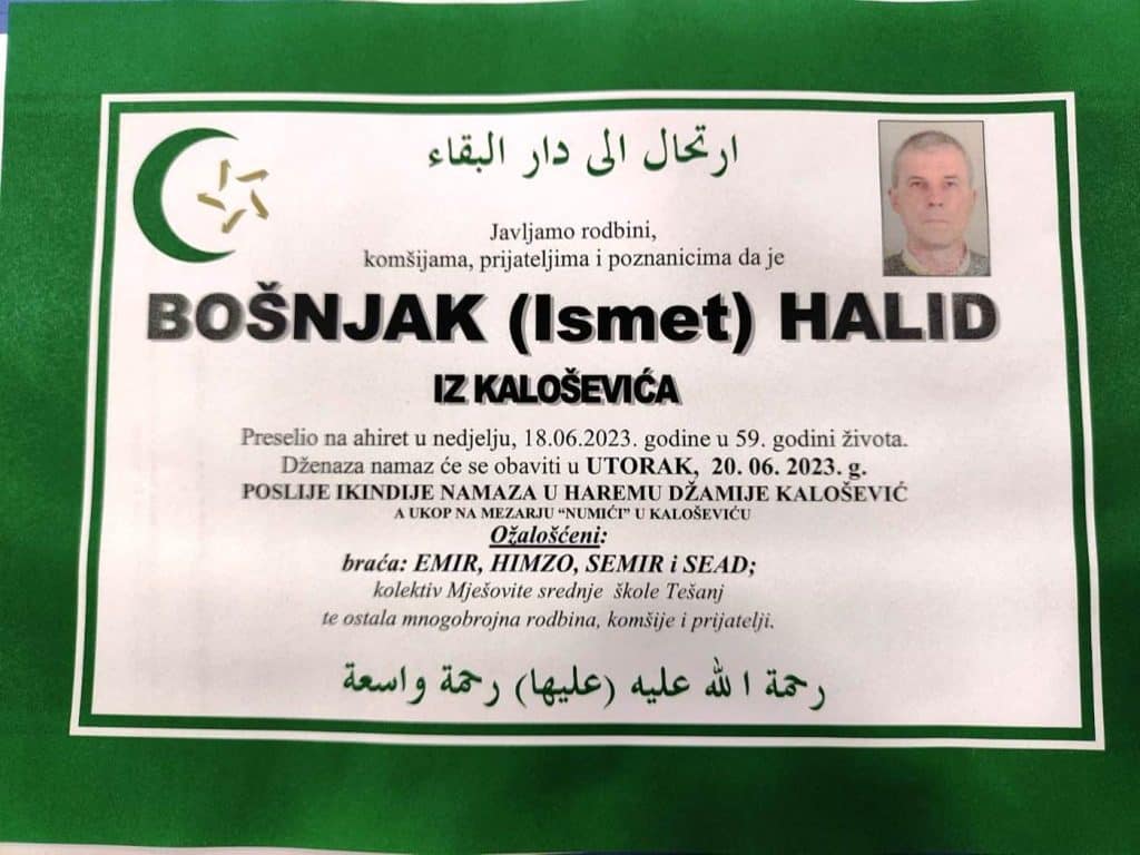 Javljamo rodbini, komšijama, prijateljima i poznanicima da je BOŠNJAK (Ismet) HALID IZ KALOŠEVIĆA Preselio na ahiret u nedjelju, 18.06.2023. godine u 59. godini života.