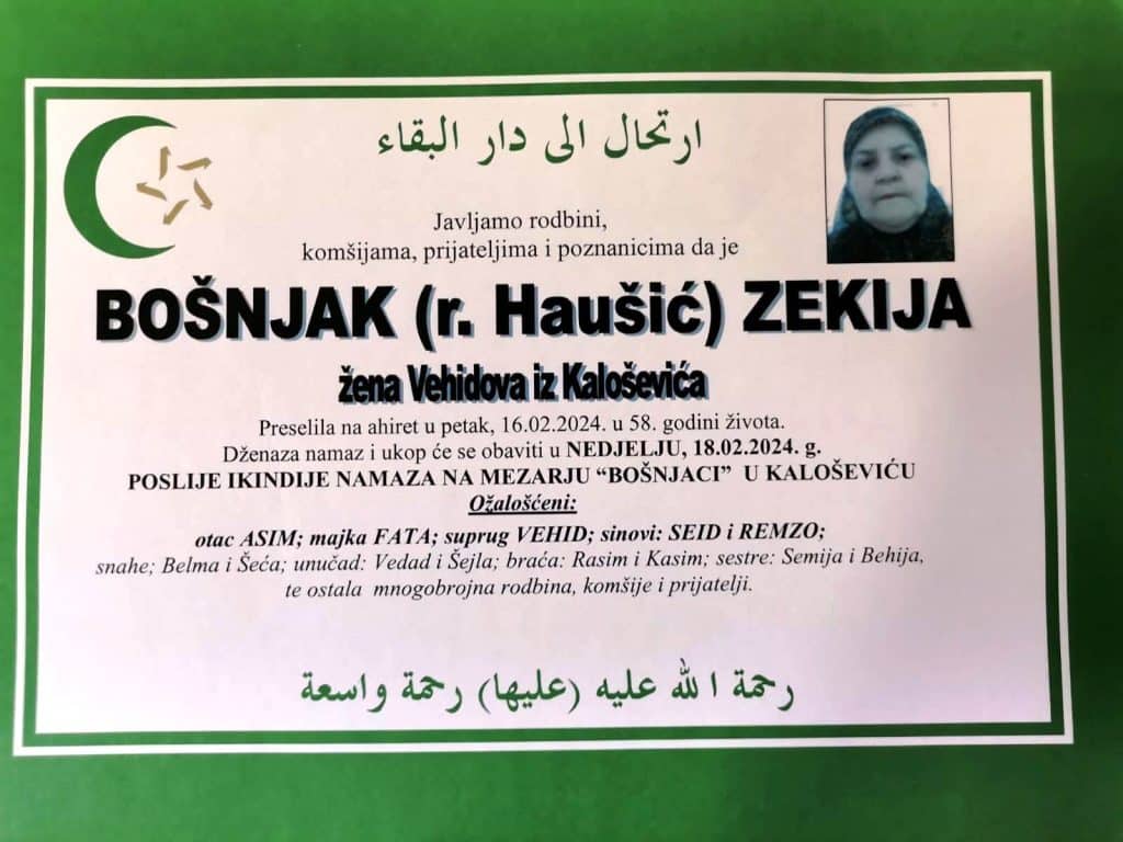 Dženaza namaz i ukop će se obaviti u NEDJELJU, 18.02.2024. g.