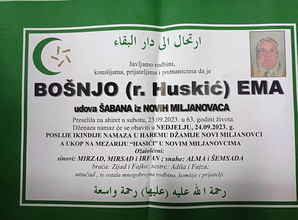 Preselila na ahiret u subotu, 23.09.2023. u 63. godini života. Dženaza namaz će se obaviti u NEDJELJU, 24.09.2023. g.