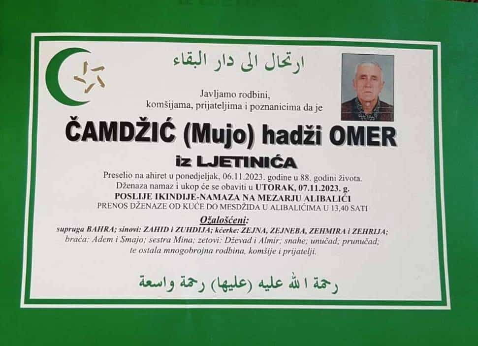 Preselio na ahiret u ponedjeljak, 06.11.2023. godine u 88. godini života. Dženaza namaz i ukop će se obaviti u UTORAK, 07.11.2023. g.