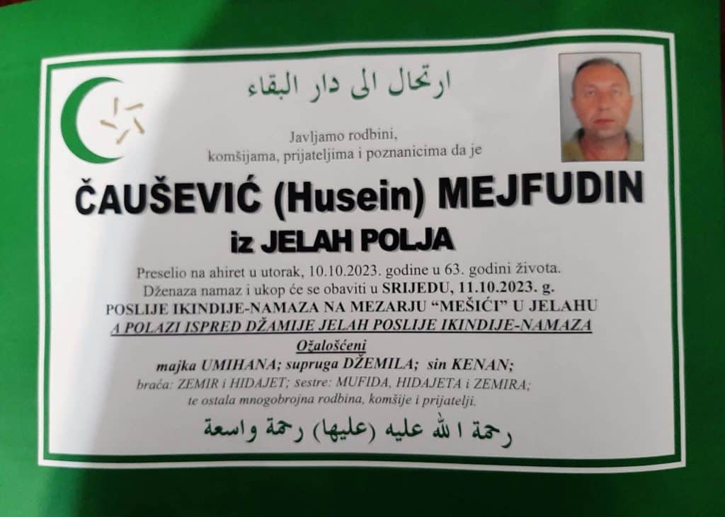 Preselio na ahiret u utorak, 10.10.2023. godine u 63. godini života. Dženaza namaz i ukop će se obaviti u SRIJEDU, 11.10.2023. g. POSLIJE IKINDIJE-NAMAZA NA MEZARJU “MEŠIĆI” U JELAHU A POLAZI ISPRED DŽAMIJE JELAH POSLIJE IKINDIJE-NAMAZA Ožalošćeni