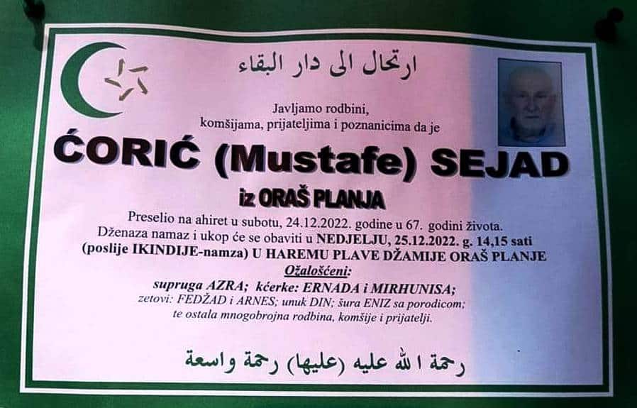 Javljamo rodbini, komšijama, prijateljima i poznanicima da je ĆORIĆ (Mustafe) SEJAD iz ORAŠ PLANJA Preselio na ahiret u subotu, 24.12.2022. godine u 67. godini života.