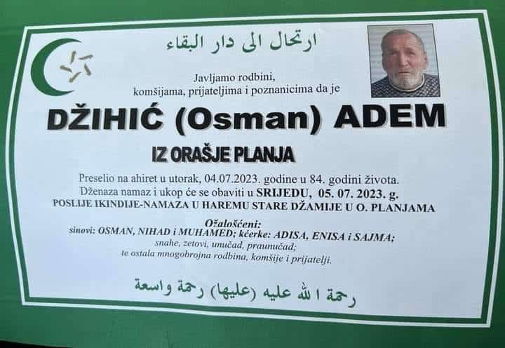 Javljamo rodbini, komšijama, prijateljima i poznanicima da je DŽIHIĆ (Osman) ADEM IZ ORAŠJE PLANJA Preselio na ahiret u utorak, 04.07.2023. godine u 84. godini života.