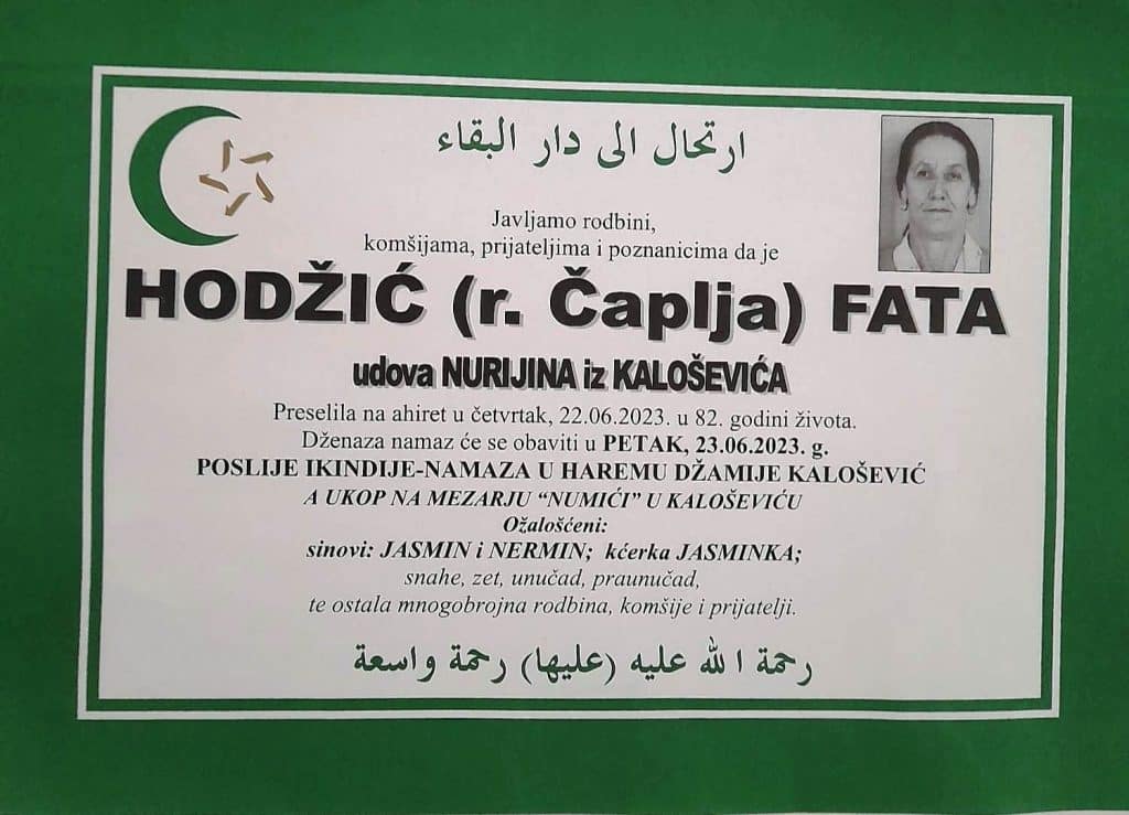 Javljamo rodbini, komšijama, prijateljima i poznanicima da je HODŽIĆ (r. Čaplja) FATA udova NURIJINA iz KALOŠEVIĆA Preselila na ahiret u četvrtak, 22.06.2023. u 82. godini života.