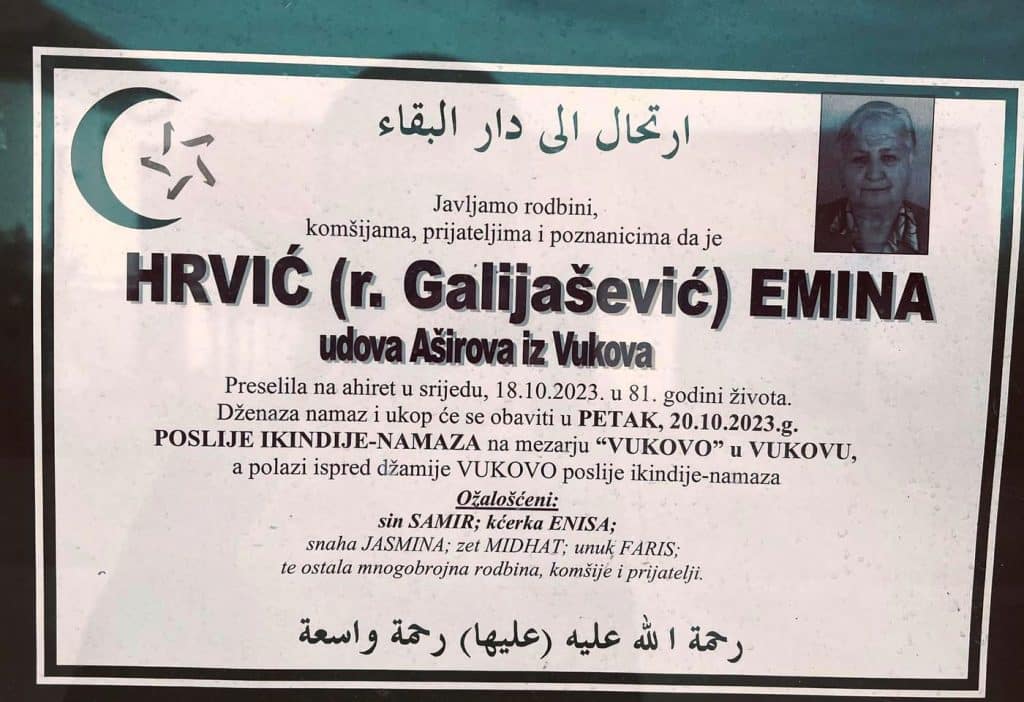 Preselila na ahiret u srijedu, 18.10.2023. u 81. godini života. Dženaza namaz i ukop će se obaviti u PETAK, 20.10.2023.g. POSLIJE IKINDIJE-NAMAZA na mezarju “VUKOVO” u VUKOVU, a polazi ispred džamije VUKOVO poslije ikindije-namaza Ožalošćeni: