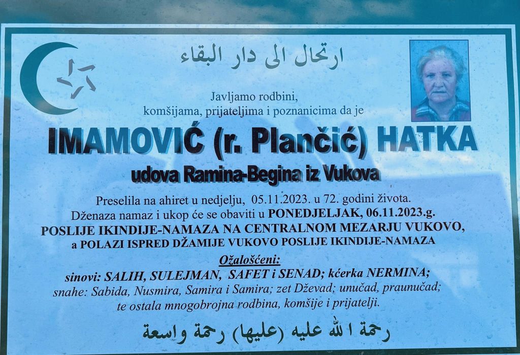 Preselila na ahiret u nedjelju, 05.11.2023. u 72. godini života. Dženaza namaz i ukop će se obaviti u PONEDJELJAK, 06.11.2023.g. POSLIJE IKINDIJE-NAMAZA NA CENTRALNOM MEZARJU VUKOVO, a POLAZI ISPRED DŽAMIJE VUKOVO POSLIJE IKINDIJE-NAMAZA Ožalošćeni: