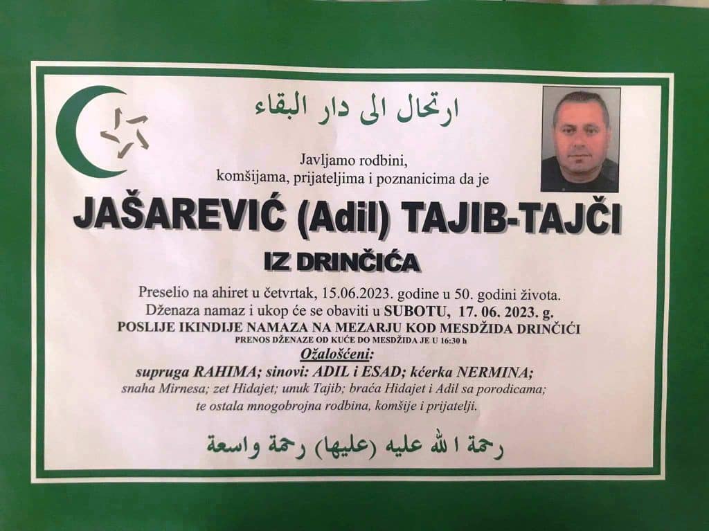 Javljamo rodbini, komšijama, prijateljima i poznanicima da je JAŠAREVIĆ (Adil) TAJIB-TAJČI IZ DRINČIĆA Preselio na ahiret u četvrtak, 15.06.2023. godine u 50. godini života.