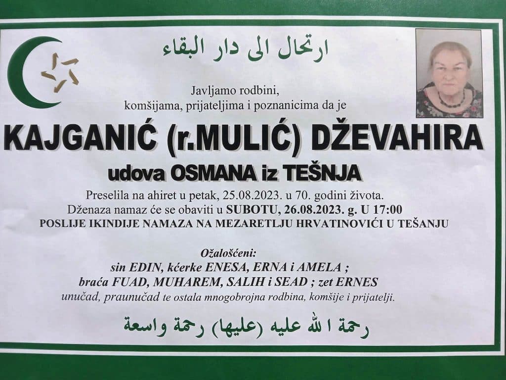Javljamo rodbini, komšijama, prijateljima i poznanicima da je KAJGANIĆ (r.MULIĆ) DŽEVAHIRA udova OSMANA iz TEŠNJA Preselila na ahiret u petak, 25.08.2023. u 70. godini života.
