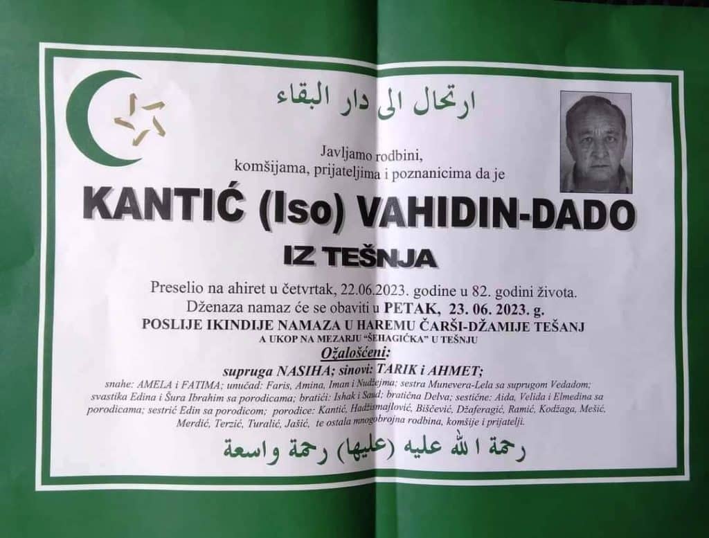 Javljamo rodbini, komšijama, prijateljima i poznanicima da je KANTIĆ (ISO) VAHIDIN-DADO IZ TEŠNJA Preselio na ahiret u četvrtak, 22.06.2023. godine u 82. godini života.