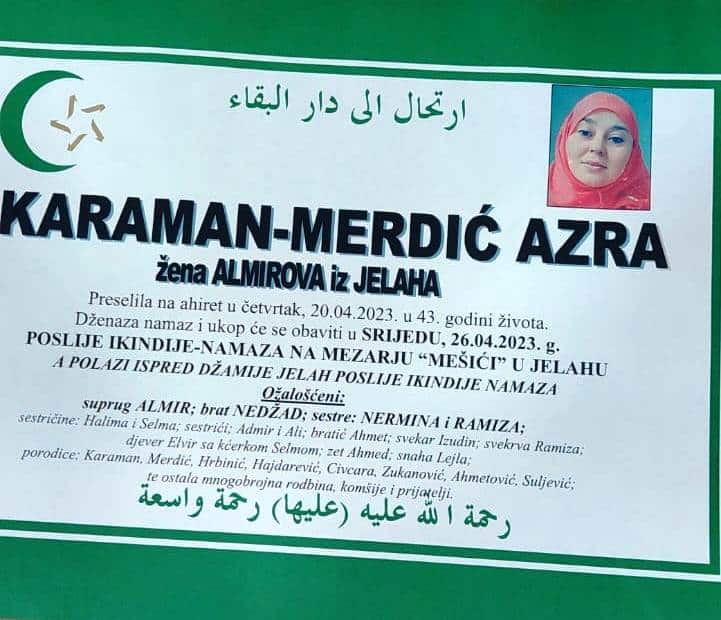 KARAMAN-MERDIĆ AZRA žena ALMIROVA iz JELAHA Preselila na ahiret u četvrtak, 20.04.2023. u 43. godini života.