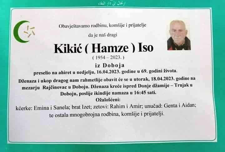 Obavještavamo rodbinu, komšije i prijatelje da je naš dragi Kikić (Hamze ) Iso (1954-2023.) iz Doboja preselio na ahiret u nedjelju, 16.04.2023. godine u 69. godini života.