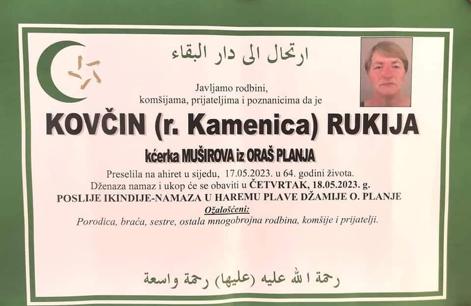 Javljamo rodbini, komšijama, prijateljima i poznanicima da je KOVČIN (r. Kamenica) RUKIJA kćerka MUŠIROVA iz ORAŠ PLANJA Preselila na ahiret u sijedu, 17.05.2023. u 64. godini života.