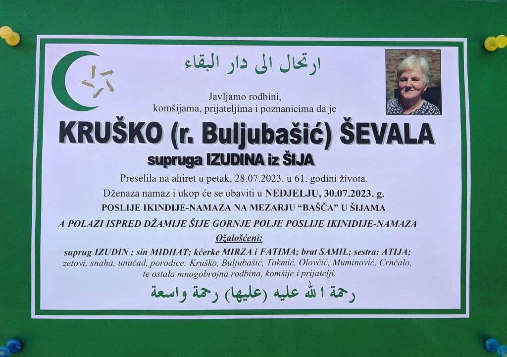 Javljamo rodbini, komšijama, prijateljima i poznanicima da je KRUŠKO (r. Buljubašić) ŠEVALA supruga IZUDINA iz ŠIJA Preselila na ahiret u petak, 28.07.2023. u 61. godini života.