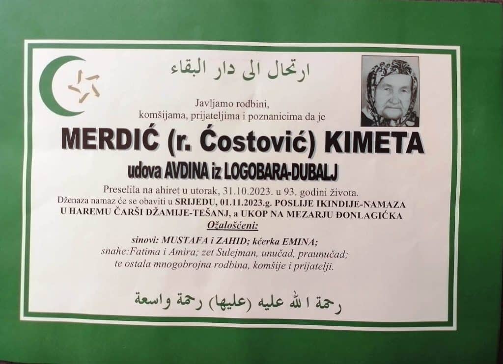 Dženaza namaz će se obaviti u SRIJEDU, 01.11.2023.g. POSLIJE IKINDIJE-NAMAZA U HAREMU ČARŠI DŽAMIJE-TEŠANJ, a UKOP NA MEZARJU DONLAGIĆKA Ožalošćeni: