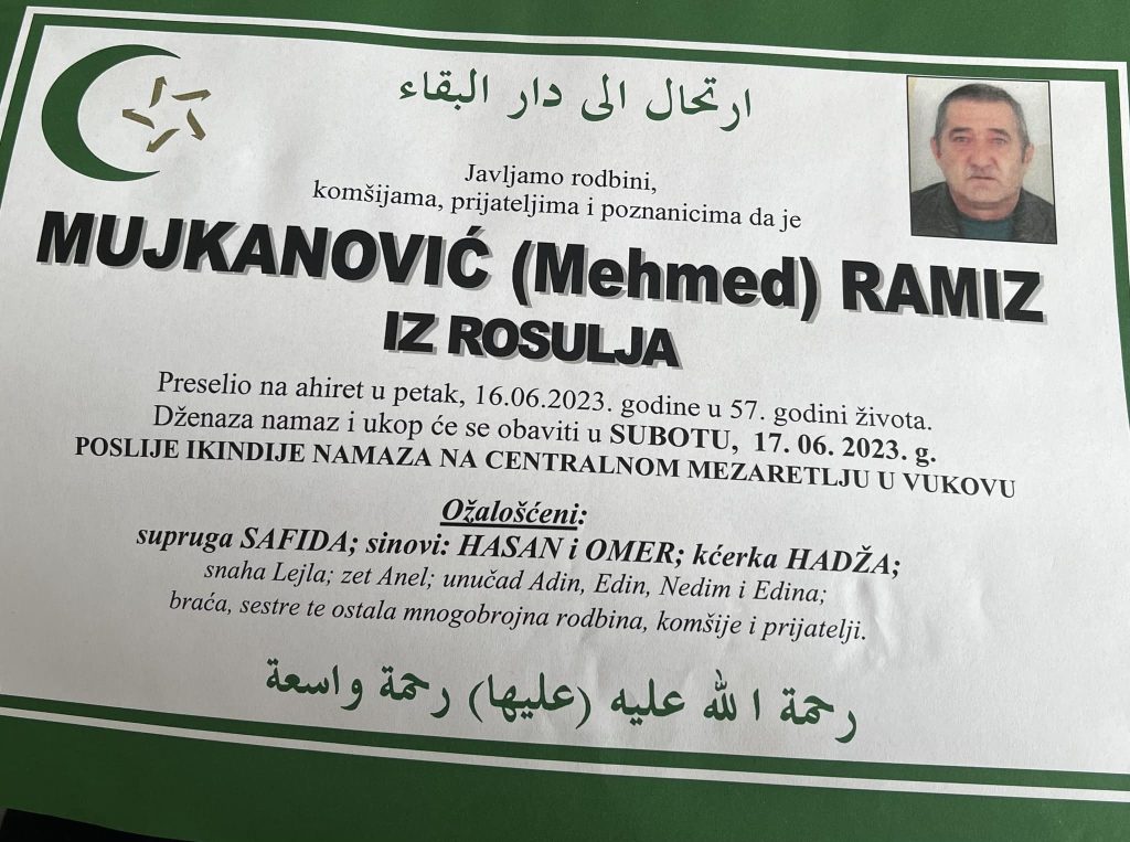 Javljamo rodbini, komšijama, prijateljima i poznanicima da je MUJKANOVIĆ (Mehmed) RAMIZ IZ ROSULJA Preselio na ahiret u petak, 16.06.2023. godine u 57. godini života.