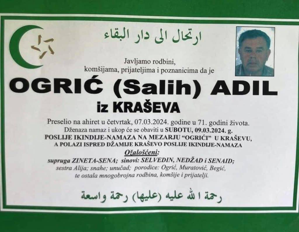 Dženaza namaz i ukop će se obaviti u SUBOTU, 09.03.2024. g.