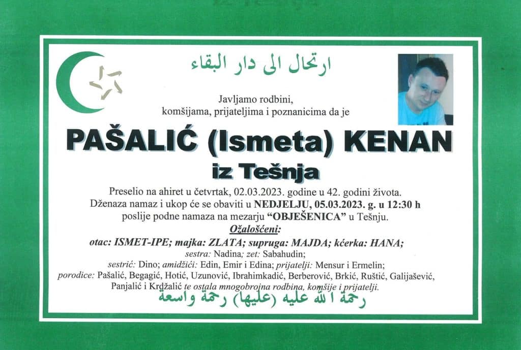ارتحال الى دار البقاء Javljamo rodbini, komšijama, prijateljima i poznanicima da je PAŠALIĆ (Ismeta) KENAN iz Tešnja Preselio na ahiret u četvrtak, 02.03.2023. godine u 42. godini života.