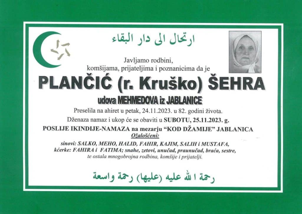 Dženaza namaz i ukop će se obaviti u SUBOTU, 25.11.2023. g.