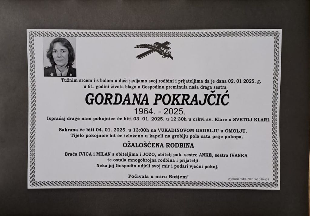 Ispraćaj drage pokojnice bit će 3. siječnja 2025. u 12.30 sati u crkvi svete Klare u Svetoj Klari, a ukop u subotu, 4. siječnja u 13 sati na Vukadinovom groblju u Omolju.