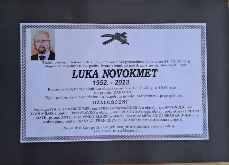 U subotu, 24. prosinca u 72. godini života blago u Gospodinu preminuo je Luka Novokmet.
