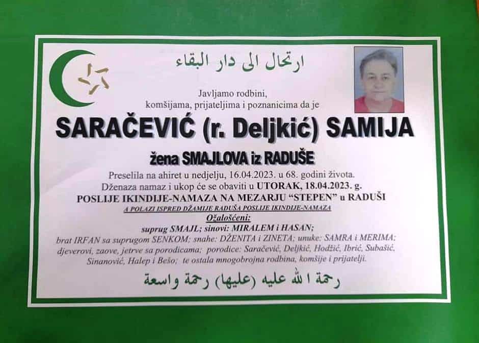 Javljamo rodbini, komšijama, prijateljima i poznanicima da je SARAČEVIĆ (r. Deljkić) SAMIJA žena SMAJLOVA iz RADUŠE Preselila na ahiret u nedjelju, 16.04.2023. u 68. godini života.
