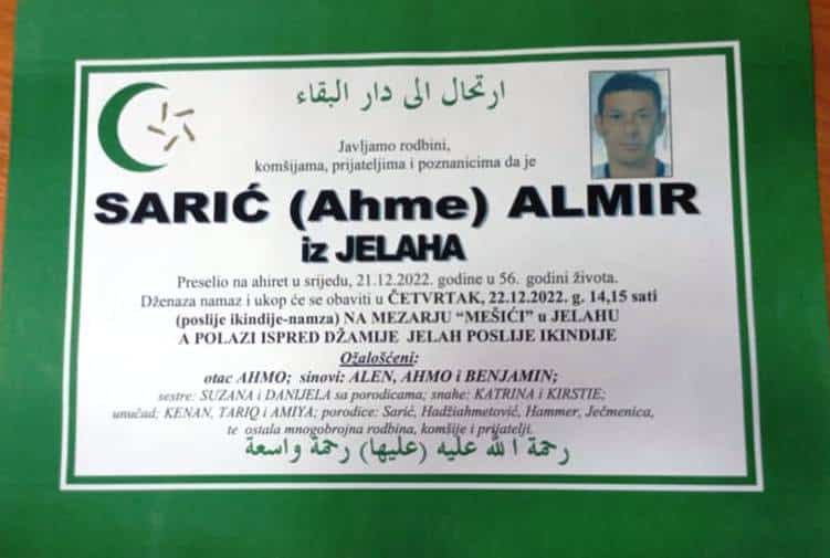 Javljamo rodbini, komšijama, prijateljima i poznanicima da je SARIĆ (Ahme) ALMIR iz JELAHA Preselio na ahiret u srijedu, 21.12.2022. godine u 56. godini života.