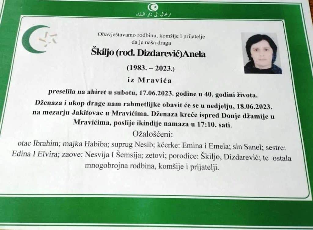 Obavještavamo rodbinu, komšije i prijatelje da je naša draga Škiljo (rođ. Dizdarević)Anela (1983.-2023.) iz Mravića preselila na ahiret u subotu, 17.06.2023. godine u 40. godini života.