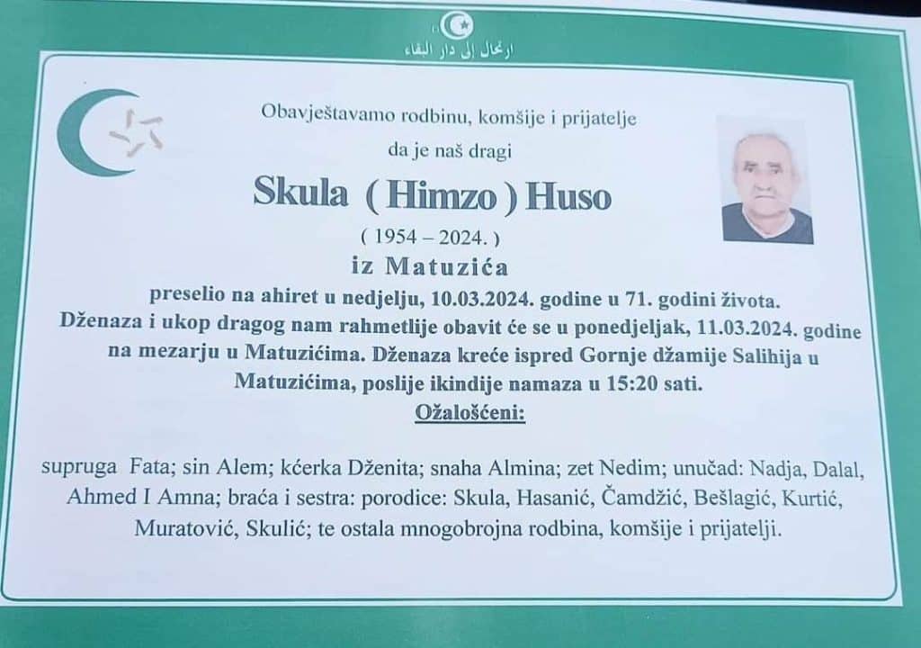 Dženaza i ukop dragog nam rahmetlije obavit će se u ponedjeljak, 11.03.2024. godine