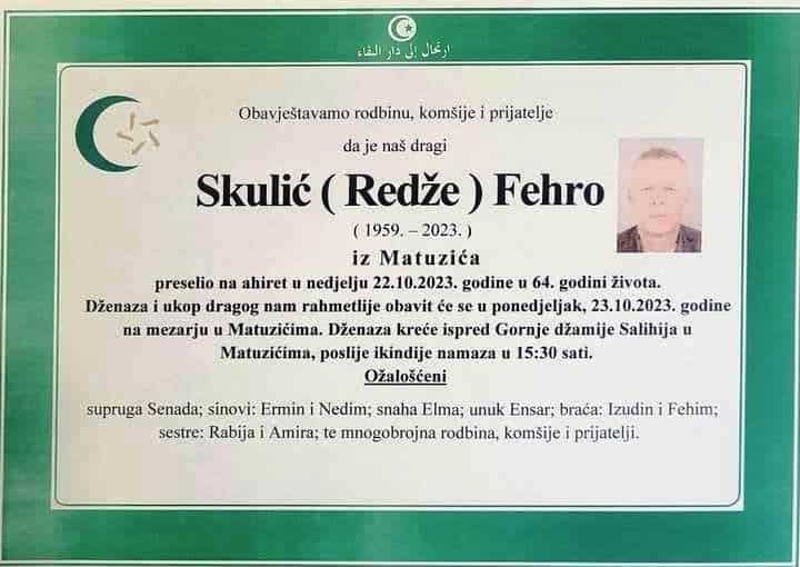 Dženaza i ukop dragog nam rahmetlije obavit će se u ponedjeljak, 23.10.2023. godine na mezarju u Matuzićima. Dženaza kreće ispred Gornje džamije Salihija u Matuzićima, poslije ikindije namaza u 15:30 sati.