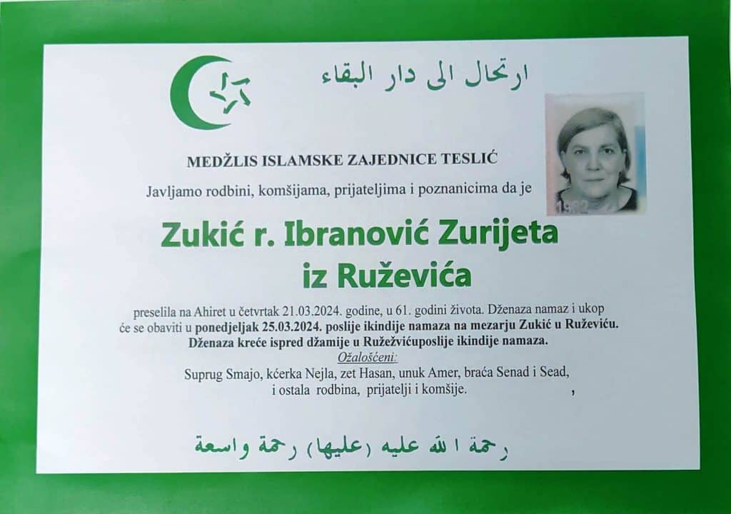 će se obaviti u ponedjeljak 25.03.2024. poslije ikindije namaza na mezarju Zukić u Ruževiću.